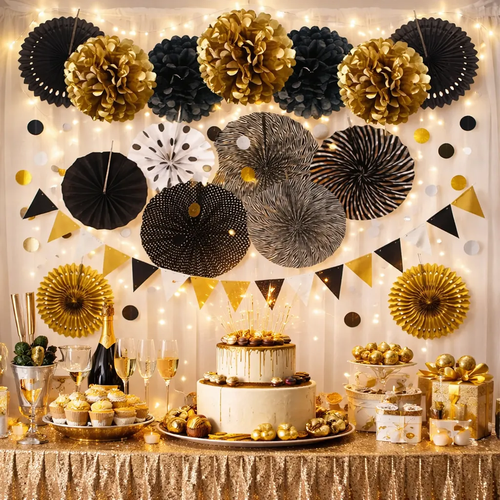 Ces rosaces et pompons noirs et dorés composent un ensemble décoratif équilibré qui attire immédiatement le regard. Les formes variées apportent du volume et rythment l’espace sans surcharge visuelle. Le contraste entre le noir profond et le doré lumineux crée une atmosphère chic et moderne. Chaque élément s’intègre facilement sur un mur ou en suspension pour habiller votre décor avec cohérence lors d’un événement festif ou d’une réception soignée.